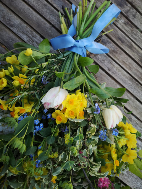 A traditional, long low arrangement designed to be placed on top of the coffin. Made from several tied bouquets, it can be either left as one arrangement or taken apart and the bouquets shared out after the service. It can be made fully biodegradable for natural/woodland burials, on request.